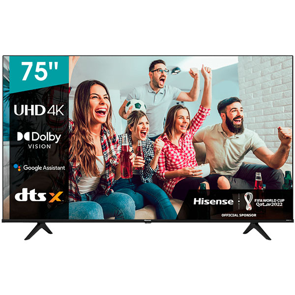 Hisense 75A6G. Tamanho do ecrã na diagonal: 190,5 cm (75"), Resolução: 3840 x 2160 pixels, Tipo de HD: 4K Ultra HD, Tecnologia de apresentação: LCD, Formato do ecrã: Plano, Tipo de retroiluminação LED: Direct-LED. Smart TV. Luminosidade: 350 cd/m², Tempo de resposta: 8 ms, Rácio de contraste (típico): 1200:1, Proporção de imagem nativa: 16:9. Sistema de formato de sinal digital: DVB-C, DVB-S, DVB-S2, DVB-T, DVB-T2. Wi-Fi, Ethernet LAN. Cor do produto: Preto