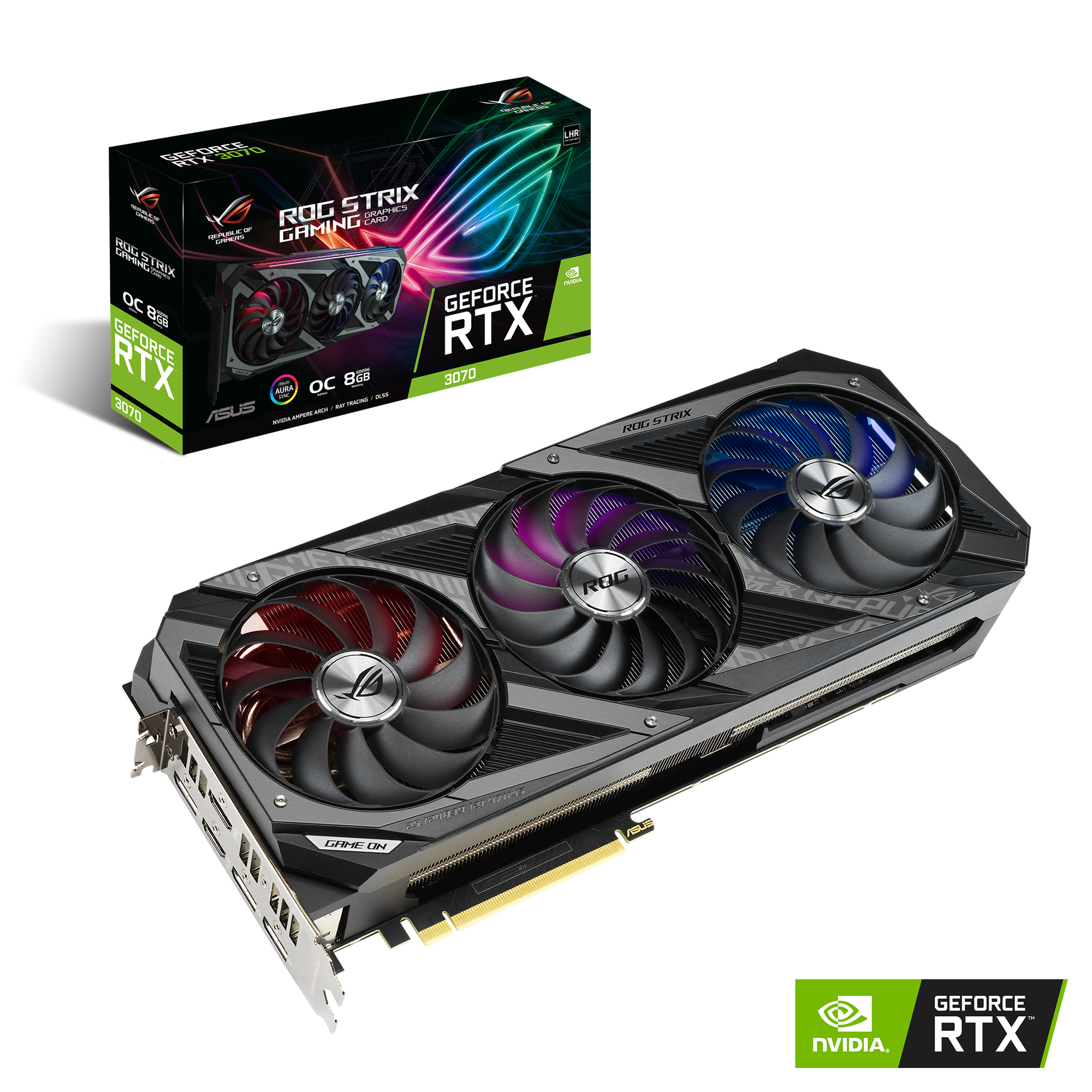 ASUS ROG -STRIX-RTX3070-O8G-V2-GAMING. Família de processadores gráficos: NVIDIA, Processador gráfico: GeForce RTX 3070. Memória de placa gráfica discreta: 8 GB, Tipo de memória da placa gráfica: GDDR6, Memória bus: 256 bit. Resolução Máxima: 7680 x 4320 pixels. Versão DirectX: 12 Ultimate, Versão OpenGL: 4.6. Tipo de interface: PCI Express 4.0. Tipo de refrigeração: Ativo, Número de ventoínhas: 3 ventoinha(s), Cor de iluminação: Multi